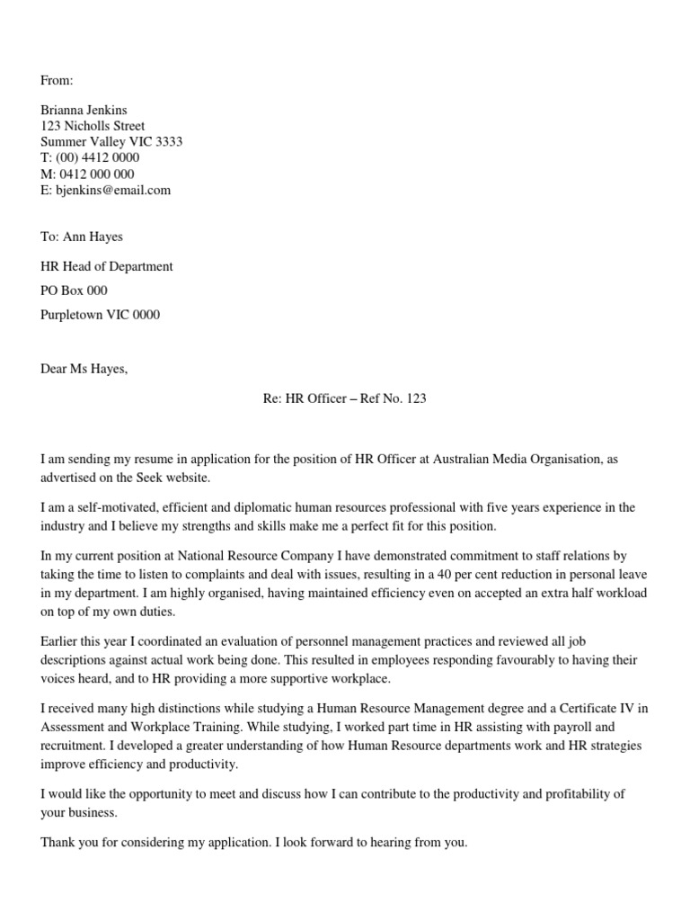 But a cover letter summarizes these skills and makes them more personal. In your letter, reference your most relevant or exceptional qualifications to help employers see why you're a great fit for the role. Human resources analyst cover letter example. It is important for you to consider the work post that you would like to be considered for employment so you can provide relevant and important details which can help you get the attention of employers. This free sample cover letter for a human resources officer has an accompanying human resources officer sample resume and human resources officer sample job ad to help you put together a winning job application.