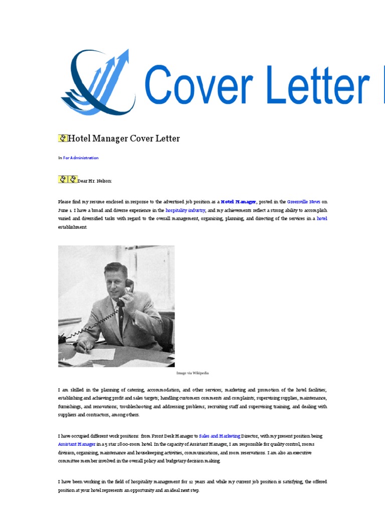 The high end of the pay range for your hotel and hospitality cover letter depends on your experience and your profession. Don't lose your dream job. Your winning cover letter from the only firm to guarantee the best cv! Hotel receptionist cover letter hotel receptionists work in the hospitality industry and assist guests during their stay. Here's a list of essential skills to highlight in a hospitality cover letter: